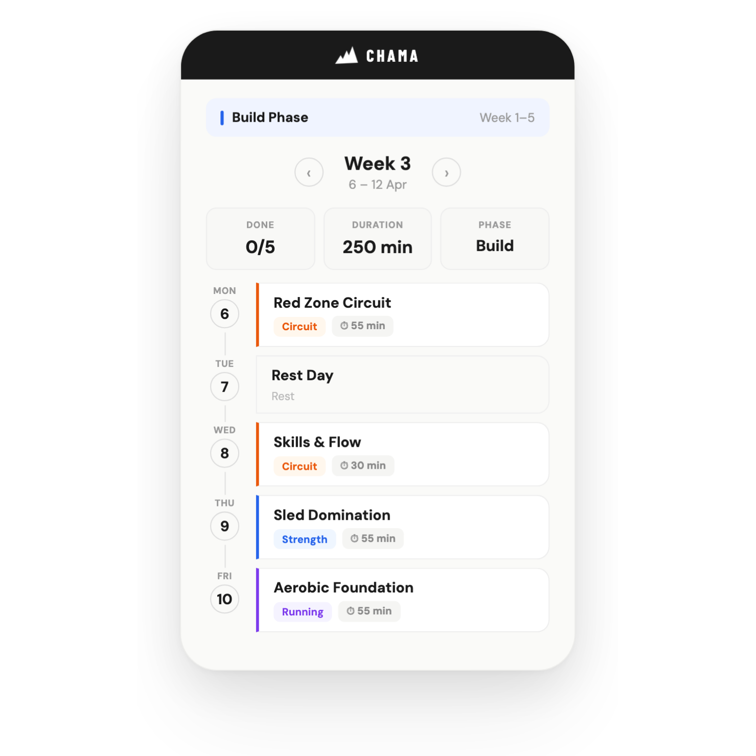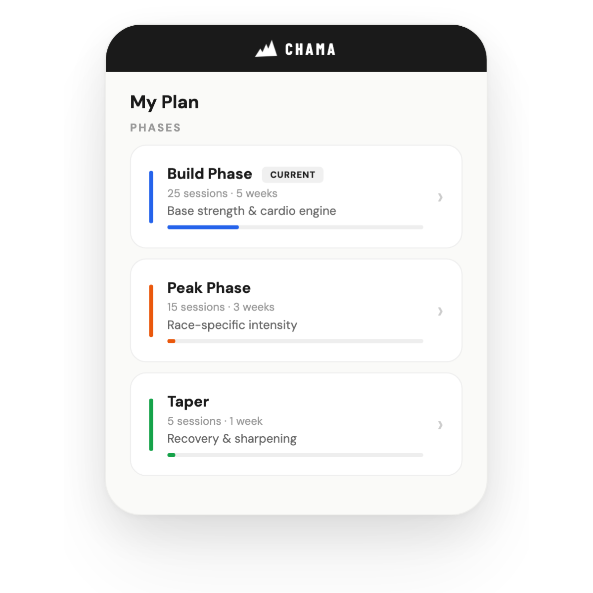 Chama builds tailor-made training plans using advanced sport science and periodization — so you progress as fast as possible toward your goal.