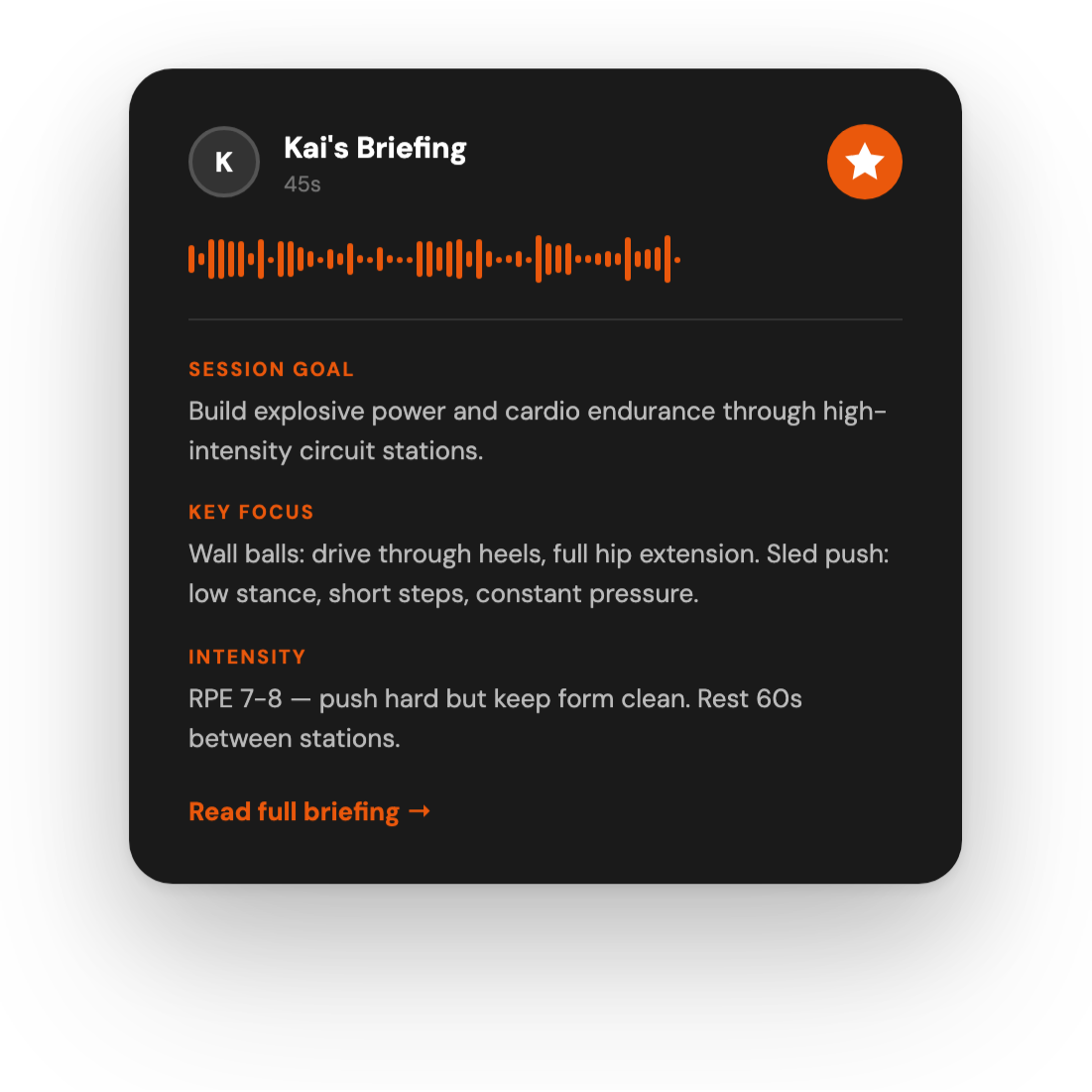 Every session, Kai briefs you with audio — coaching tips, intensity targets, and nutrition.