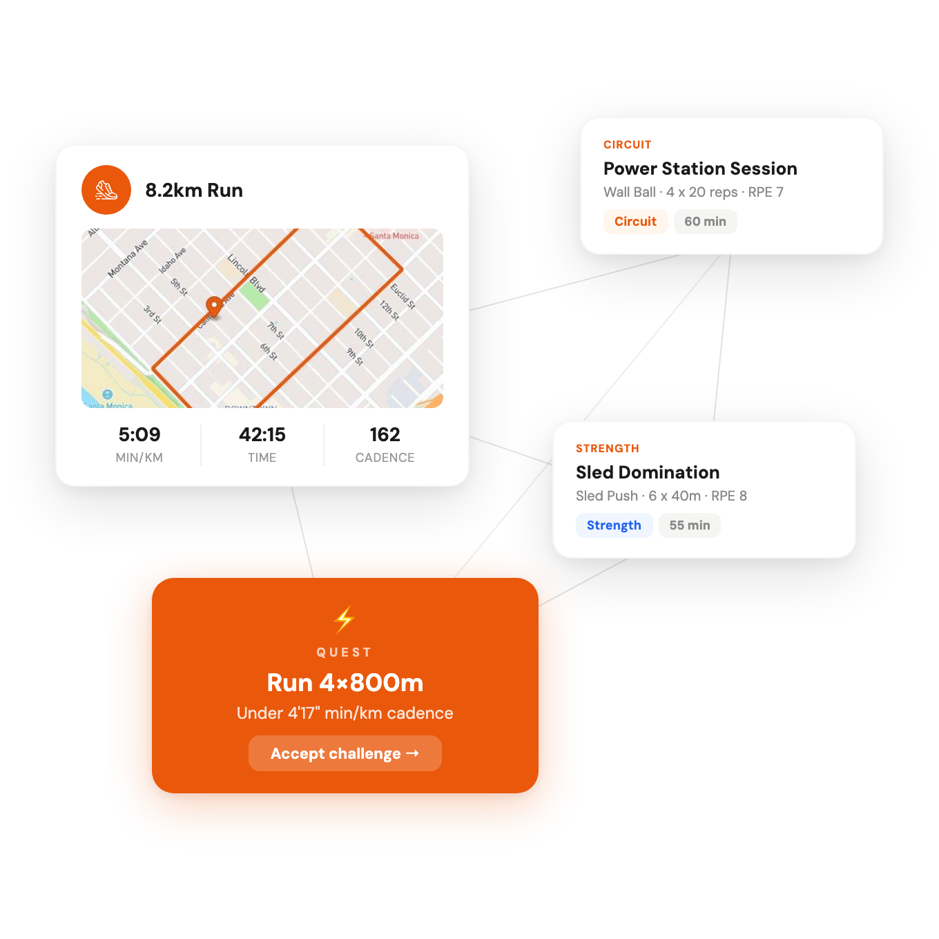 No more random workouts. Each week is a carefully designed sequence — strength, cardio, skills, recovery — all building on each other to drive real progress.
