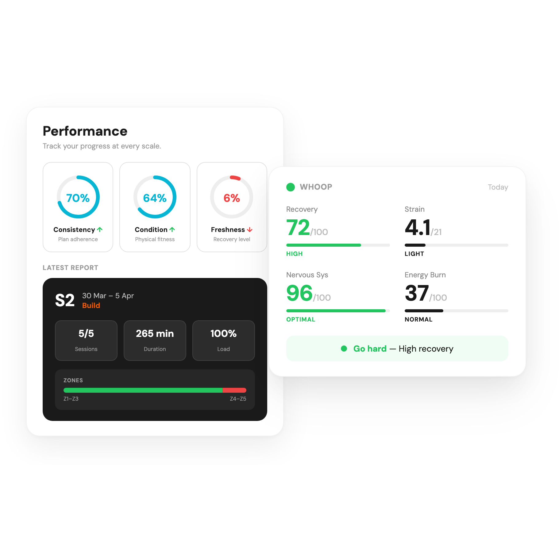 Complete training programs with periodization. Every session calibrated to your fitness level.