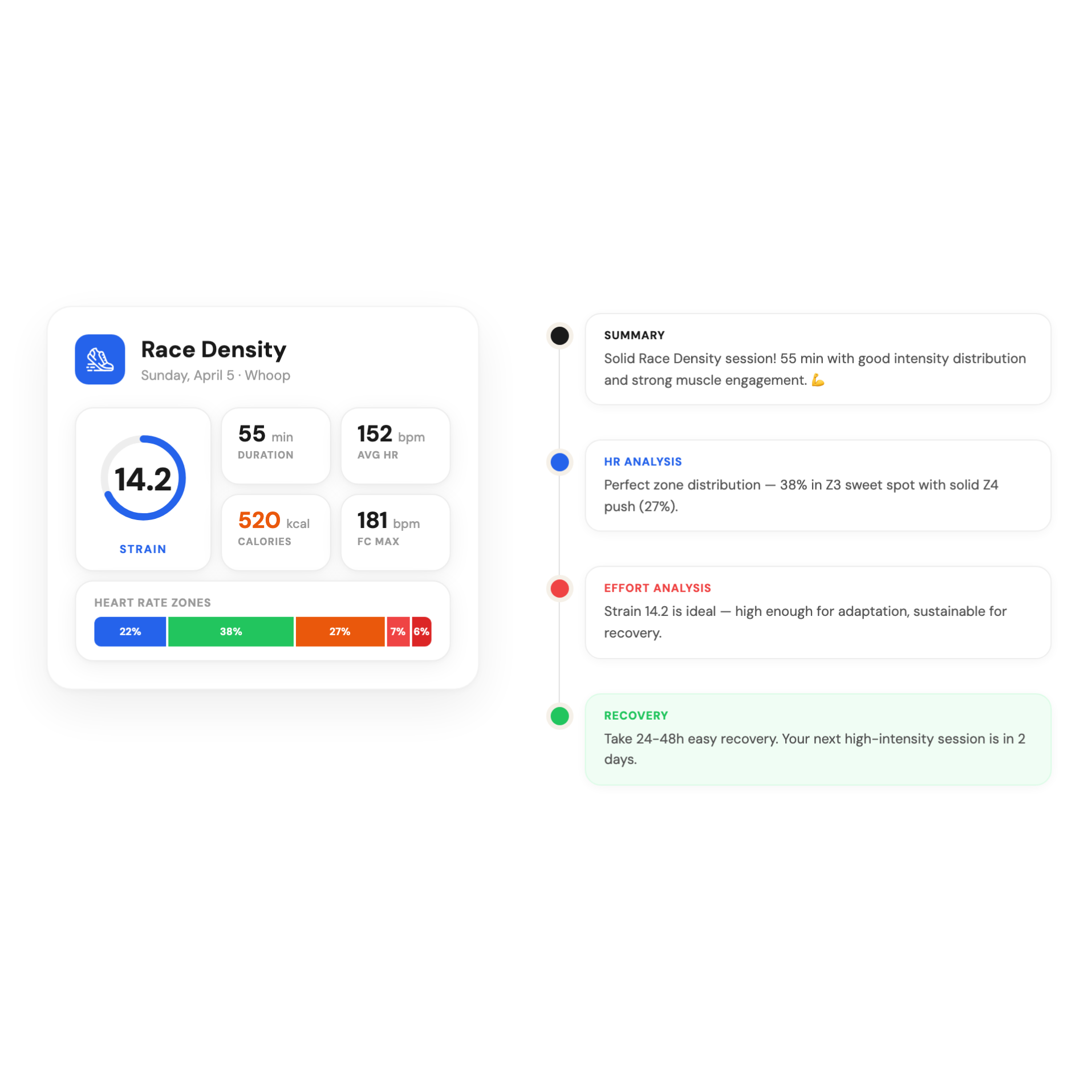 AI-powered workout debriefs with heart rate analysis, effort breakdown, and recovery advice.