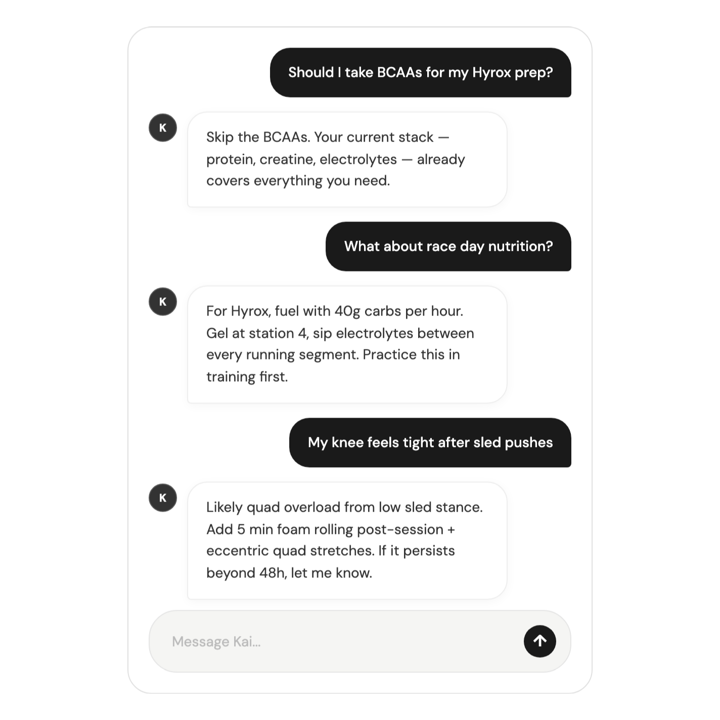 Nutrition, recovery, technique, race strategy — Kai is your AI coach available 24/7 to answer any question and guide your decisions.