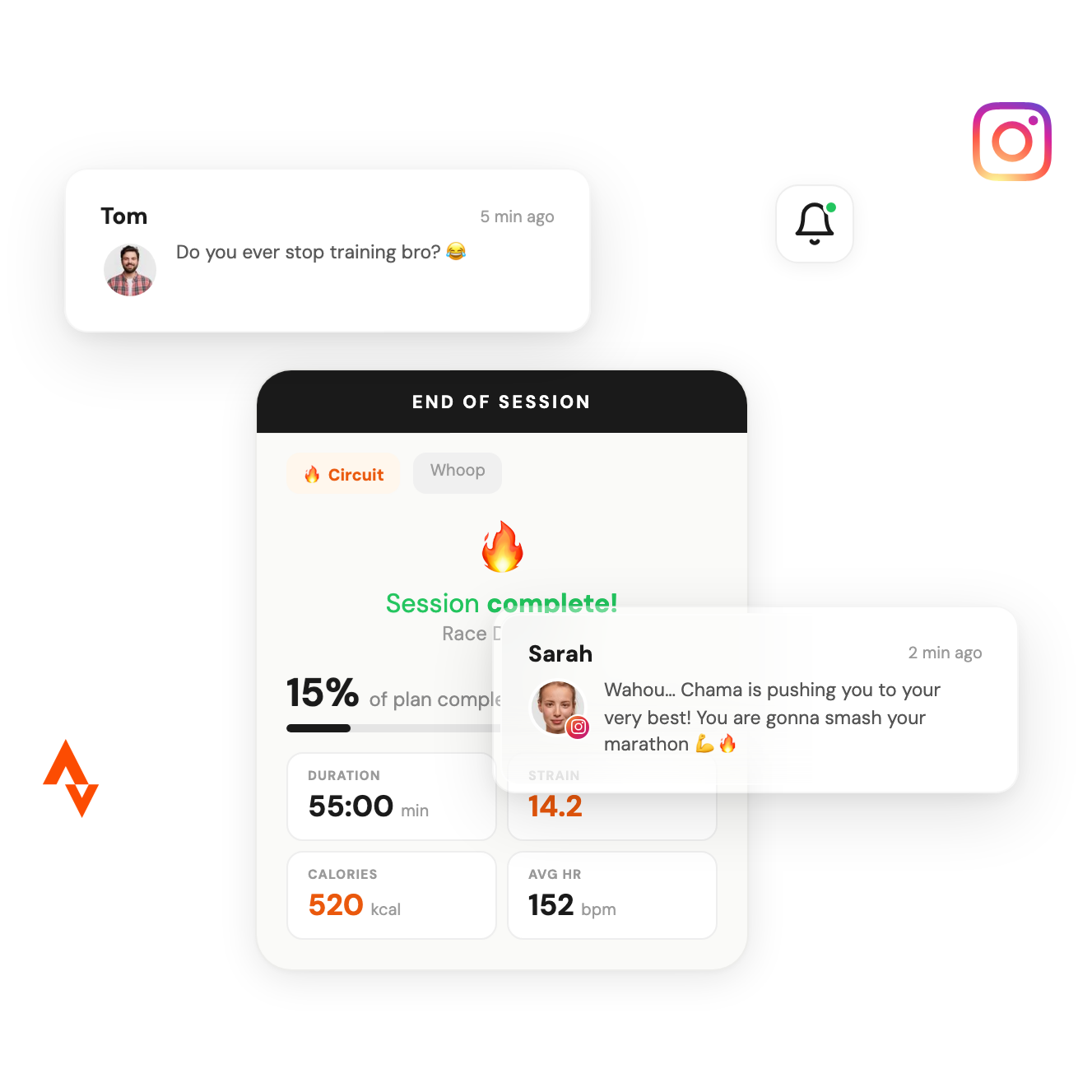 Celebrate every milestone. Share your sessions to Strava, post to Instagram, and get cheered by your community.
